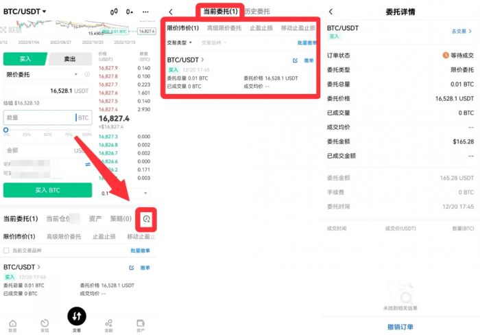 03 进入币对交易页面后,在买入界面,选择买入方式,输入买入价格、数量/金额,点击买入BTC即可。买入方式通常为限价委托,可以设置理想的价格进行购买。下单成功还未成交时,可看到委托单信息并可随时撤单。