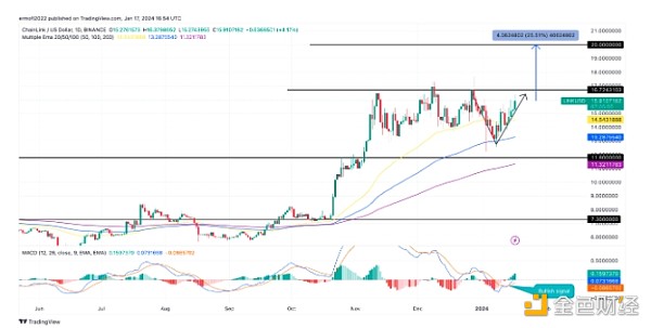 Chainlink的LINK代币在1月17日飙升7%,交易价格达到16美元,这是2023年12月29日的水平。这巩固了其作为市值第11大加密货币(不包括稳定币)的地位。