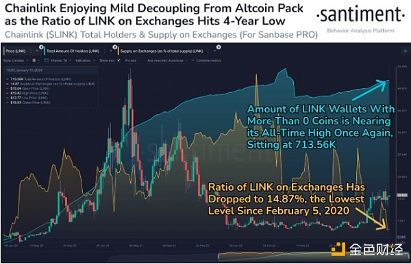 与此同时,持有超过 0 LINK 的钱包数量增加了 6%,“再次接近历史最高点,达到 713,560 个”,加密数据情报机构 Santiment 在 1 月 15 日在 X 上发布的帖子中表示。