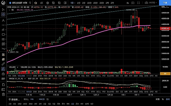 大饼昨日走势如思路一致,整体呈震荡下行走势,最低跌至42210一线支撑反弹,恭喜跟上思路的朋友,目前币价在42620附近运行,四小时级别行情跌破42500支撑后向下缓冲一段,k线收针有阴转阳走出反弹,但力度不大,macd多头逐步缩量双线粘合状态,短期走势活动空间逐渐变窄,走势没什么变化震荡为主,日线级别再次试探ma200可见支撑力度较强,k线收阴反弹力度不大整体走势偏弱,加上幅图指标呈死叉,ma7向下指引,日内空头占优势,4w是多空分界线,有下跌试探支撑的可能,思路建议反弹高空为主低多为辅,上方压制43000-43500,下方支撑42000-41500