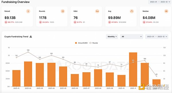 在资本加持下,将加速加密生态往更完善的方向发展。区块链基础设施在过去几年发展迅速,加上VC资本的催化,为新的应用和创新创造了必要的条件。2017 年至 2022 年期间约有 734 亿美元流入加密相关企业和项目。2023 全年,总的融资额达到9.13b美金,总融资轮次为1178。