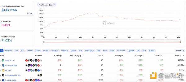 据Blockworks数据显示,截止2024年1月12日,美国现货比特币ETF上市首日交易量达到46亿美元,其中灰度的GBTC交易量超过21亿美元,贝莱德的IBIT超过10亿美元,富达的FBTC超过6.8亿美元。彭博社高级ETF分析师Eric Balchunas表示,比特币现货ETF上市的两天里,九家发行机构已经吸收了 14 亿美元的资金,超过 GBTC 5.79 亿美元的流出,净流入总额 8.19 亿美元。无论是传统宏观基金还是超高净值人群,都为加密行业持续注入了大量的流动性。从另外的角度看,链上稳定币的体量也在不断增加,表明新资金开始持续流入。DefiLlama数据显示,稳定币总市值为133b美元,再创新高,其中USDT市值达94.9b美元,市占率为71%。
