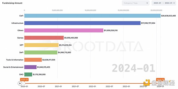 2020年1月至2024年1月,融资的品类除了CeFi,很大规模流向了基础设施、Games、NFT和DeFi。这些类型的项目,在熊市期间积累了足够的资金,在产品的交付上有一定的保证,成为下一波创新浪潮的新标的。