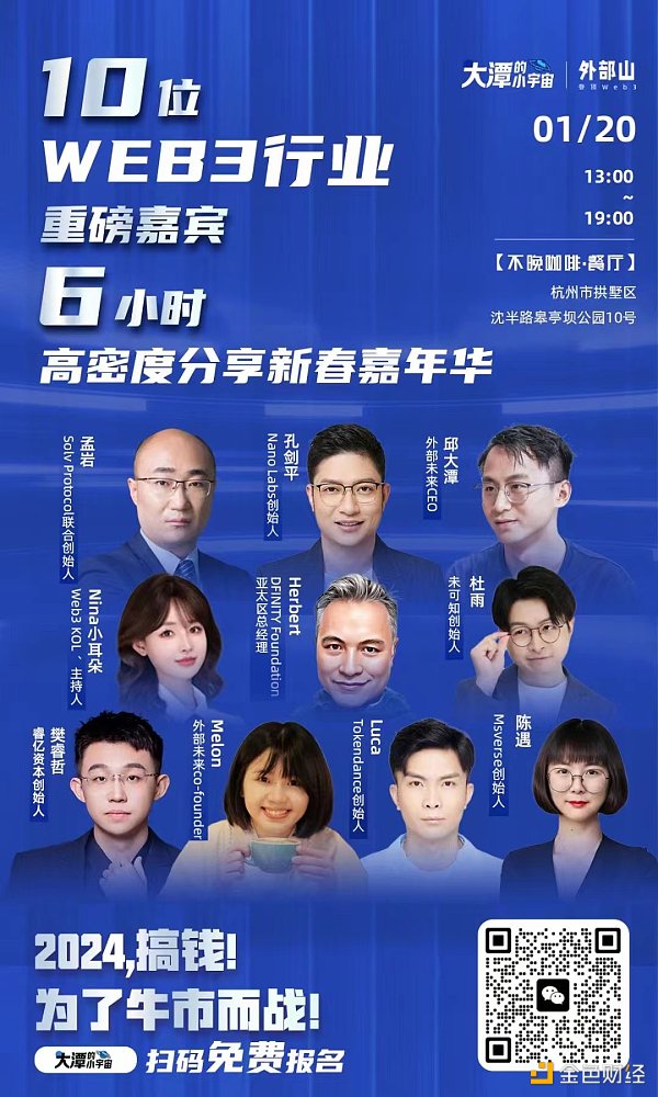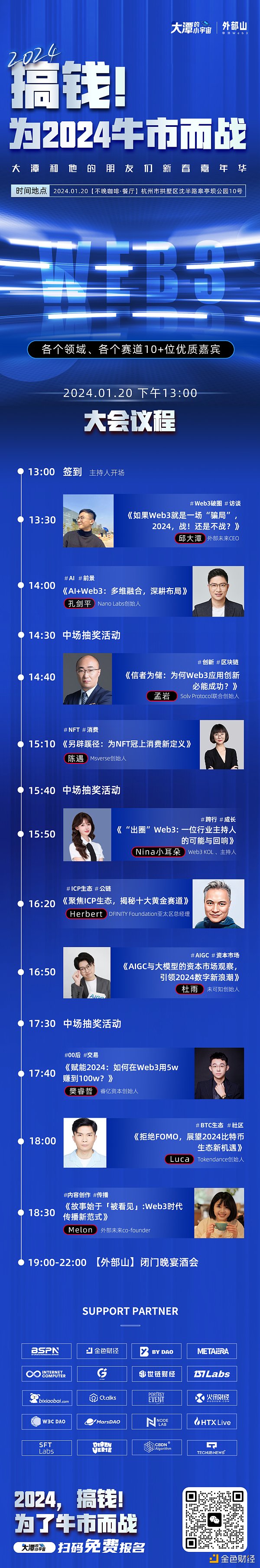 逐梦踏山海,蓄时迎龙年。1月20日,杭州,期待各路精英齐聚一堂,共同拆解Web3新风向,迎接Web3新机遇,拉开2024年牛市璀璨的序幕。
