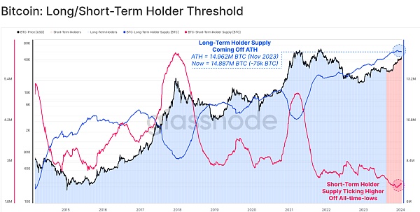 长期持有者似乎正在降低风险并获利了结,比特币持有量从2023年11月创下的历史最高点减少75000个。交易量的下降加上短期持有者的增加,可能会导致比特币价格持续下跌。