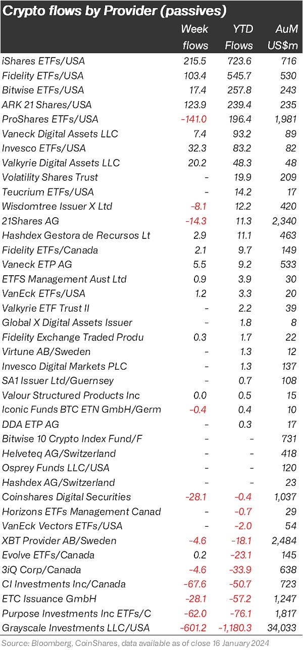CoinShares研究主管James Butterfill在推特发文称,截至2024年1月16日的本周,投资者将资金转向成本较低的美国基金,导致净流出总额达到4.24亿美元。