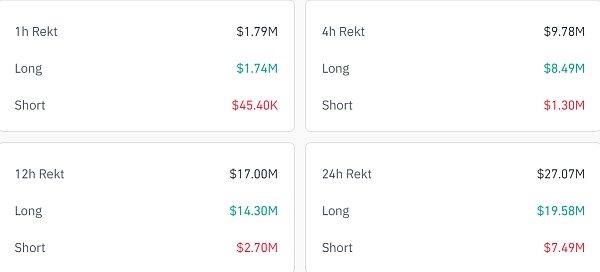 CoinTelegraph指出,通过观察清算情况可以发现比特币期货市场的剧烈波动。多头清算的时间恰逢波动性加剧。1月17日的24小时内,超过2700万美元的多头和空头头寸被清算。比特币多头清算占据了每日清算量的大部分,市场损失了1950万美元。