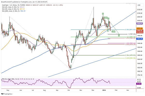 如果从近期波动高点2088美元(A)开始的当前调整最终只下跌了两腿,那么接下来应该会恢复更大的牛市趋势。市场现在看到,自上周五高点(C)以来的第二次下跌趋势仍在继续。