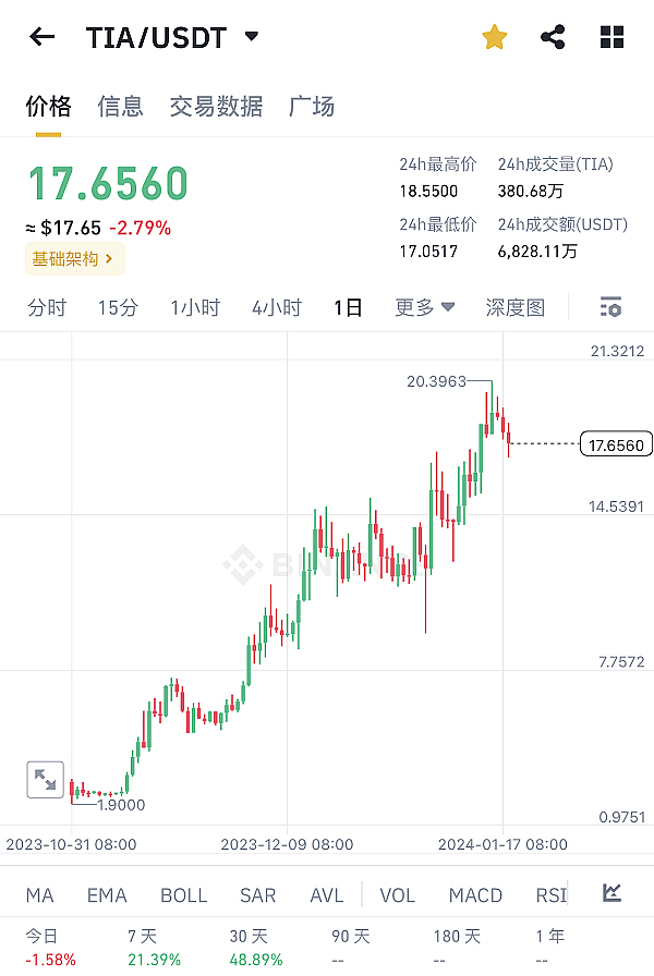 最近TIA表现亮眼,从上线1.9美元,一路涨到20美元,涨幅超过10倍,当前18美元。