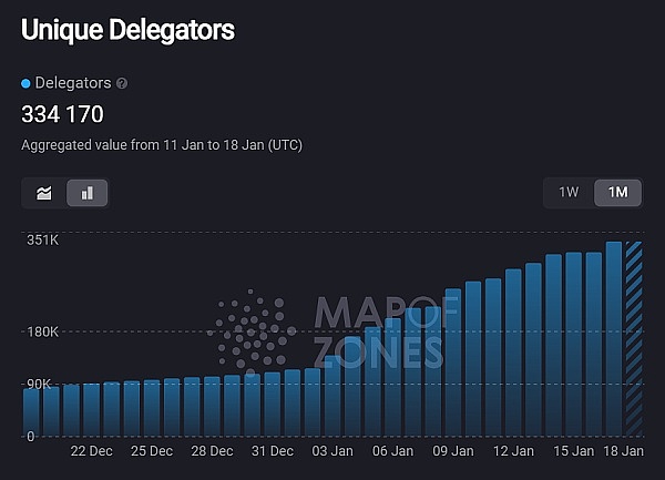 根据数据分析平台Map of Zones 显示,质押 TIA 地址数量已增至 33.4 万个,而一个月前地址数才只有82,595,月增幅超过 400%。