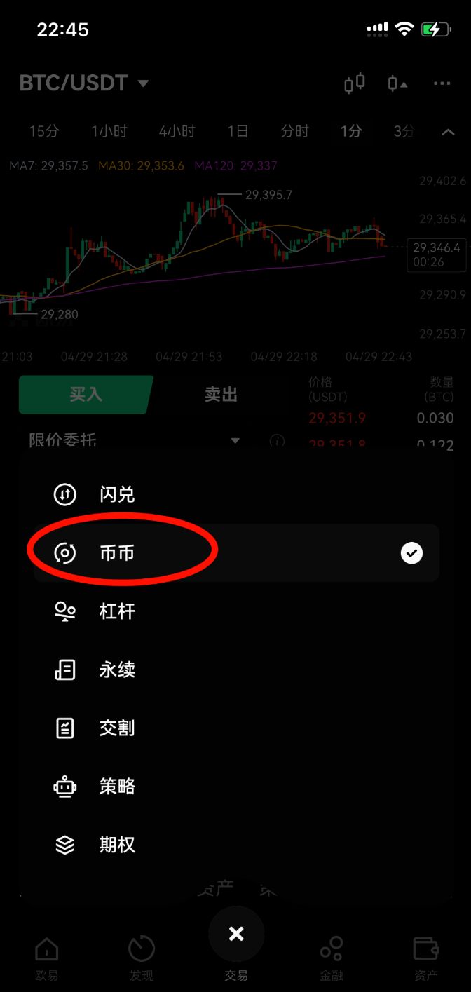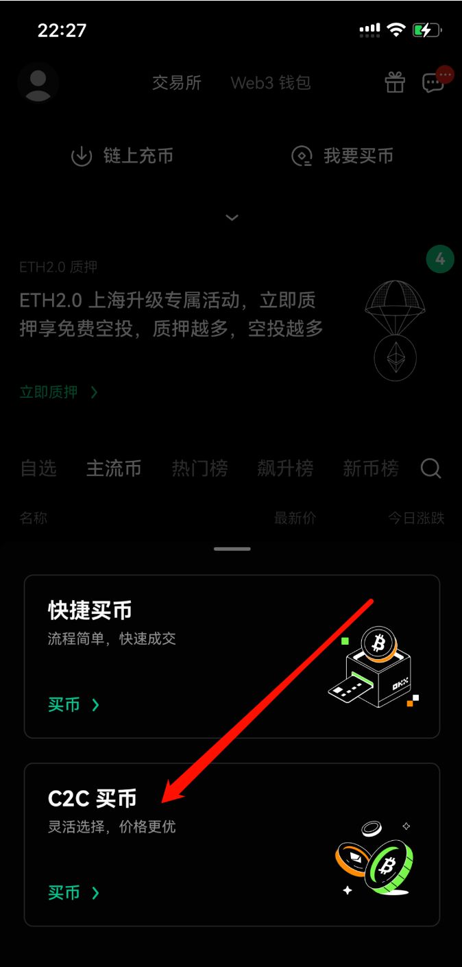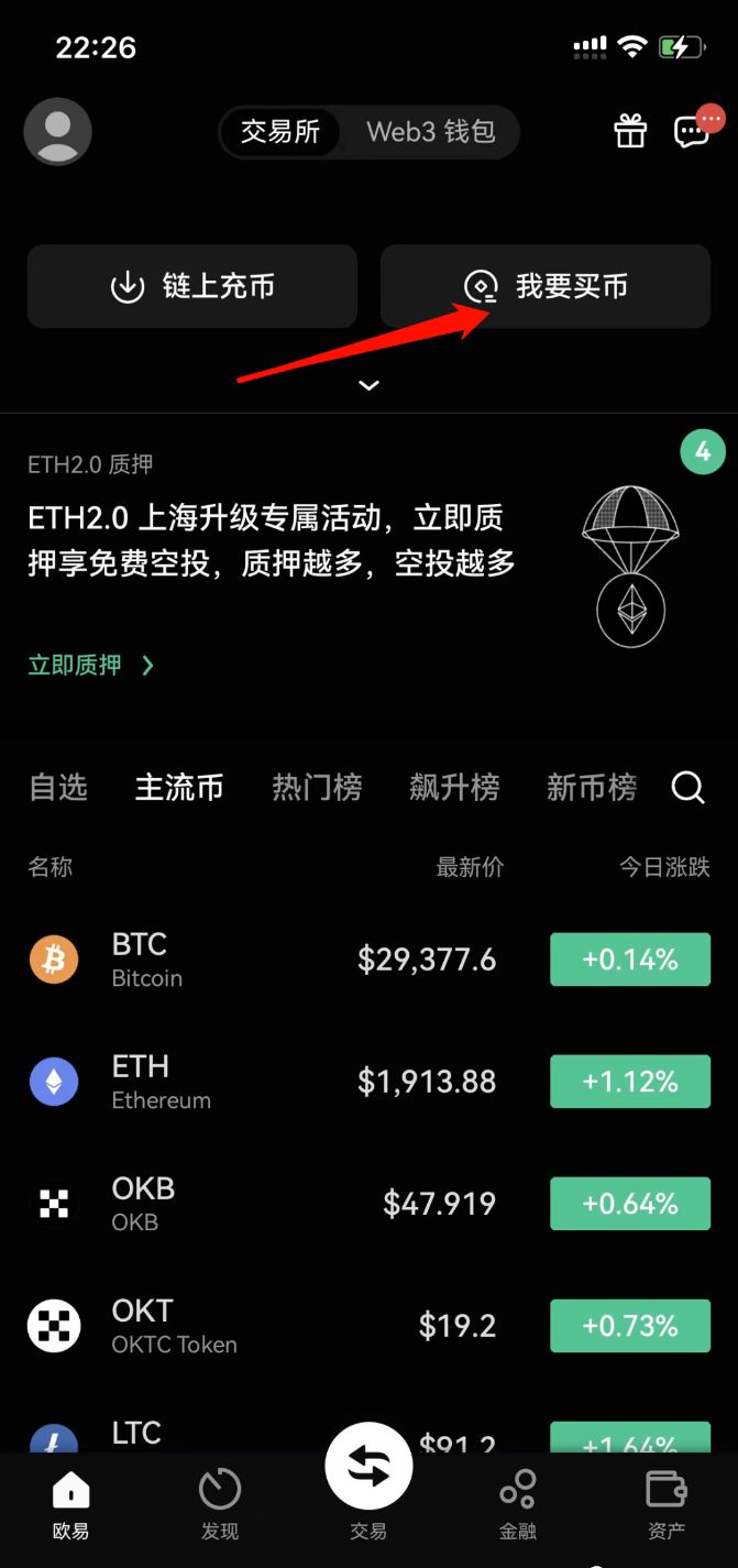 1、打开OKX app,点击我要买币
