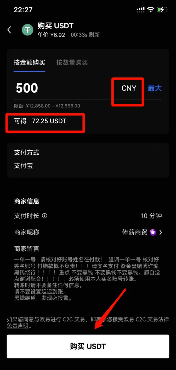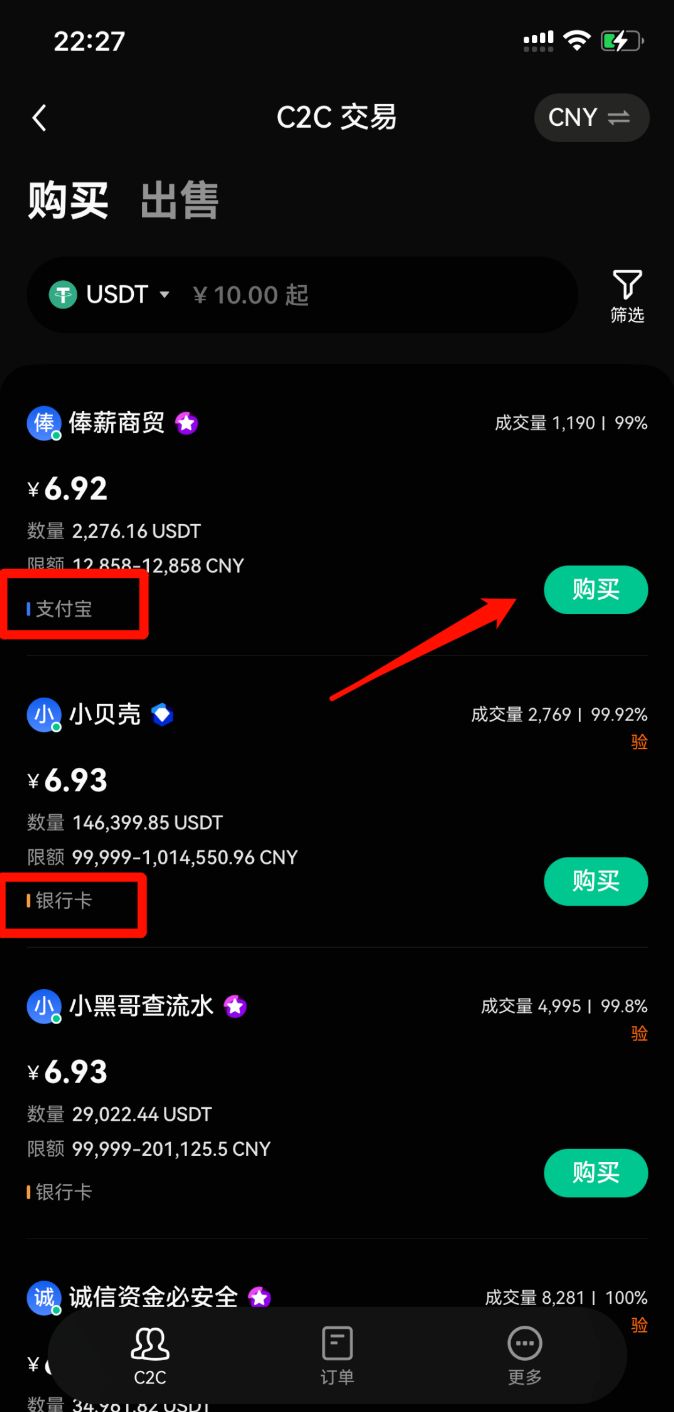 3.选择购买USDT,有的是用支付宝付款给对方,有的是进行银行卡转账,选择自己想要用来支付的账户选择商家,