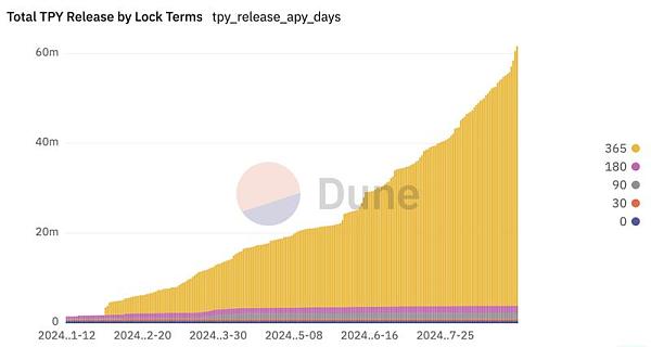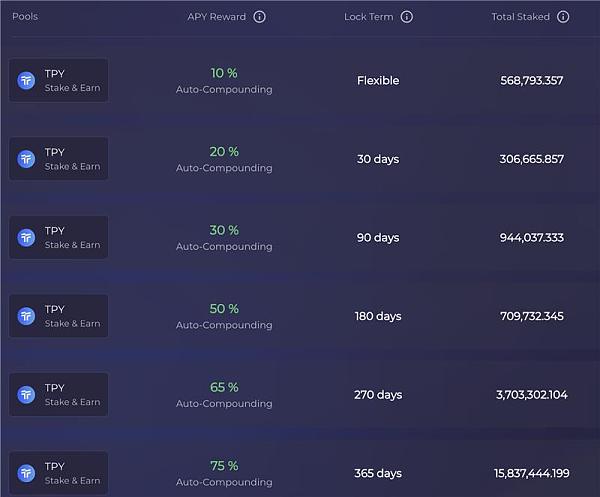 协议的整个经济模型不全面且没有收入,只拥有一个质押挖矿的Dapp——在ETH\Arbitrum上质押tpy。长期以来,也只是通过吸引散户质押代币锁仓来控制tpy的流通盘,来减小拉盘的阻力。而挖矿收益的分布也十分简单粗暴,根据不同的锁仓时间来获得对应的币本位挖矿奖励。