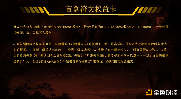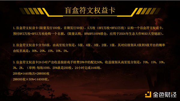 产出说明:盲盒符文权益卡24小时产出收益按游戏手续费20%中的配比50%。收益根据权益卡等级从高到低分别是:70%,15%,10%,3%,2%