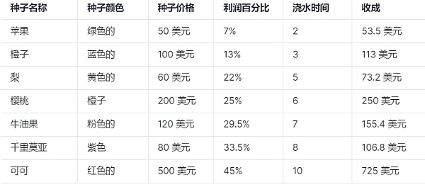 借助 ORACLE 系统,玩家可以保证从他们选择购买和种植的每种树木中获利。当玩家购买种子和收获时,代币将与美元汇率平衡。所以玩家只需要关心商店里的种子价格以及种子的利润率即可。无需关心代币的价格。种子收获后的价格及利润率信息按下表计算: