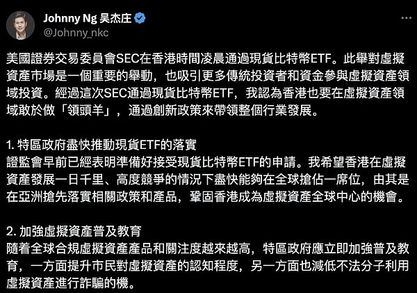 香港立法会议员吴杰庄呼吁香港特区政府在美国批准现货比特币 ETF 后,加快现货比特币 ETF 的批准。吴杰庄指出,香港证券及期货事务监察委员会此前表示已准备接受比特币 ETF 的申请:「我希望随着虚拟资产的快速发展和激烈竞争,香港能够尽快在世界上占据一席之地。这将是在亚洲实施相关政策和产品的第一个机会,并巩固香港成为全球虚拟资产中心的机遇。」