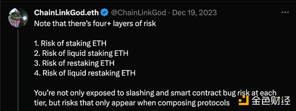 用ChainLinkGod的话说:“一种流动性再抵押代币,由存放在再抵押协议中的流动性抵押代币支持,该协议对质押的 ETH 进行再抵押。这已经变得相当严重了,我们可以在这里添加另一层流动性和风险吗?我认为我们还不够。”