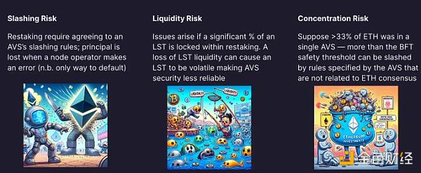 除了利用质押的 ETH 的固有风险之外,当用户选择重新质押你的代币时,他们实质上是委托 EigenLayer 合约在他们保护的任何 AVS 上出现错误、双重签名等情况下惩罚其质押的权力。