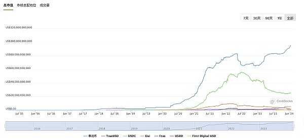 Coingecko数据显示,2020年7月,USDT市值首次突破100亿美元大关,领跑稳定币板块。