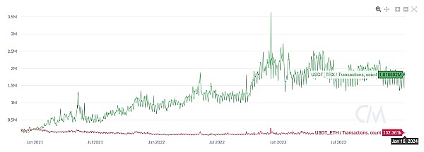 Coinmetrics数据显示,截至2024年1月16日,波场上USDT交易量达180万笔,以太坊约为13万笔,两者相差13.8倍。