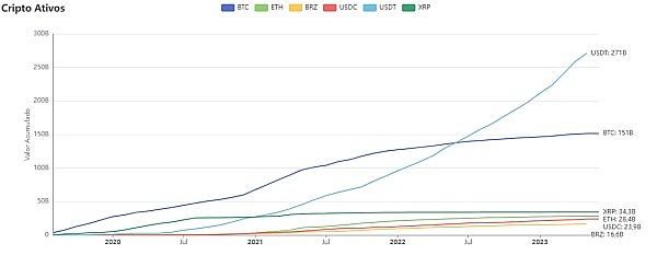 (来源:gov.br,数据截至2023年10月中旬;USDT在巴西采用率飙升,交易额达到 2710 亿巴西雷亚尔(约合 550 亿美元),几乎是该国比特币交易量的两倍)