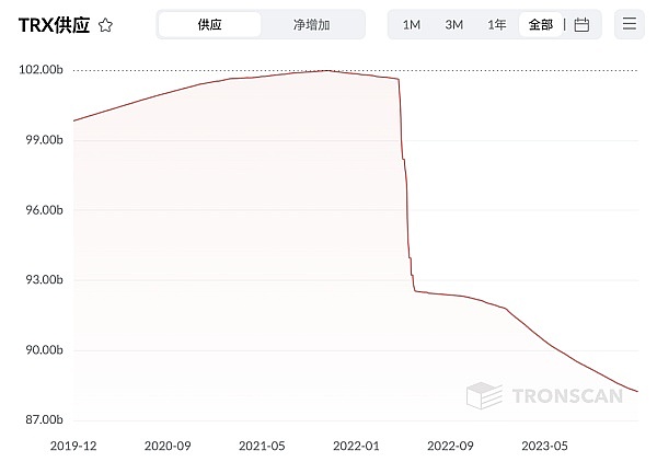 市场对USDT的需求,影响波场网络活跃度,也影响TRX供应变化。TRONSCAN显示,TRX目前处于通缩状态,2019年12月29日(UTC)至2024年1月16日(UTC)期间年化增长率为-3.00% 。