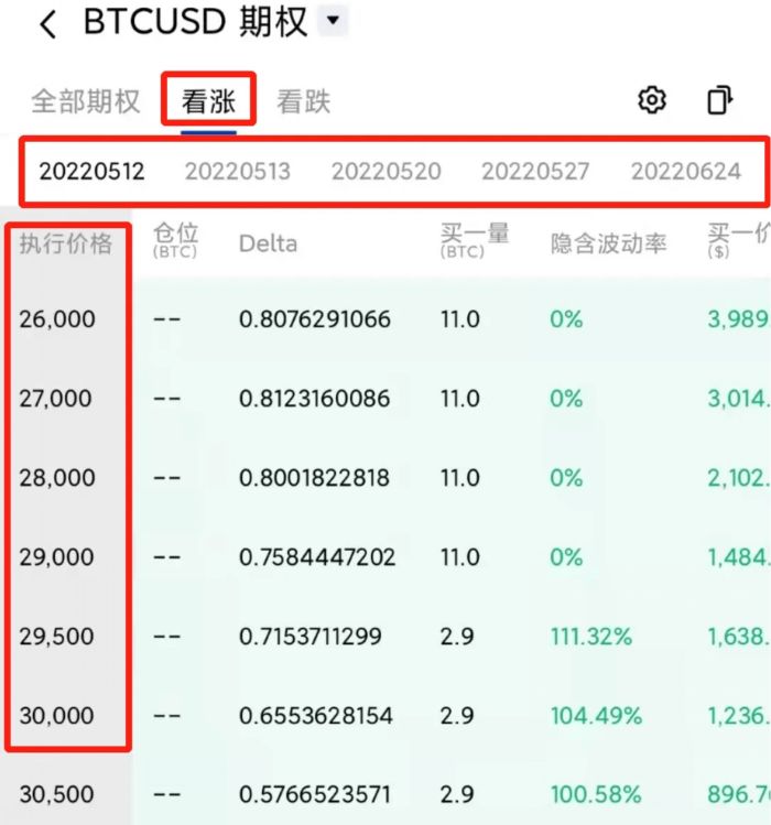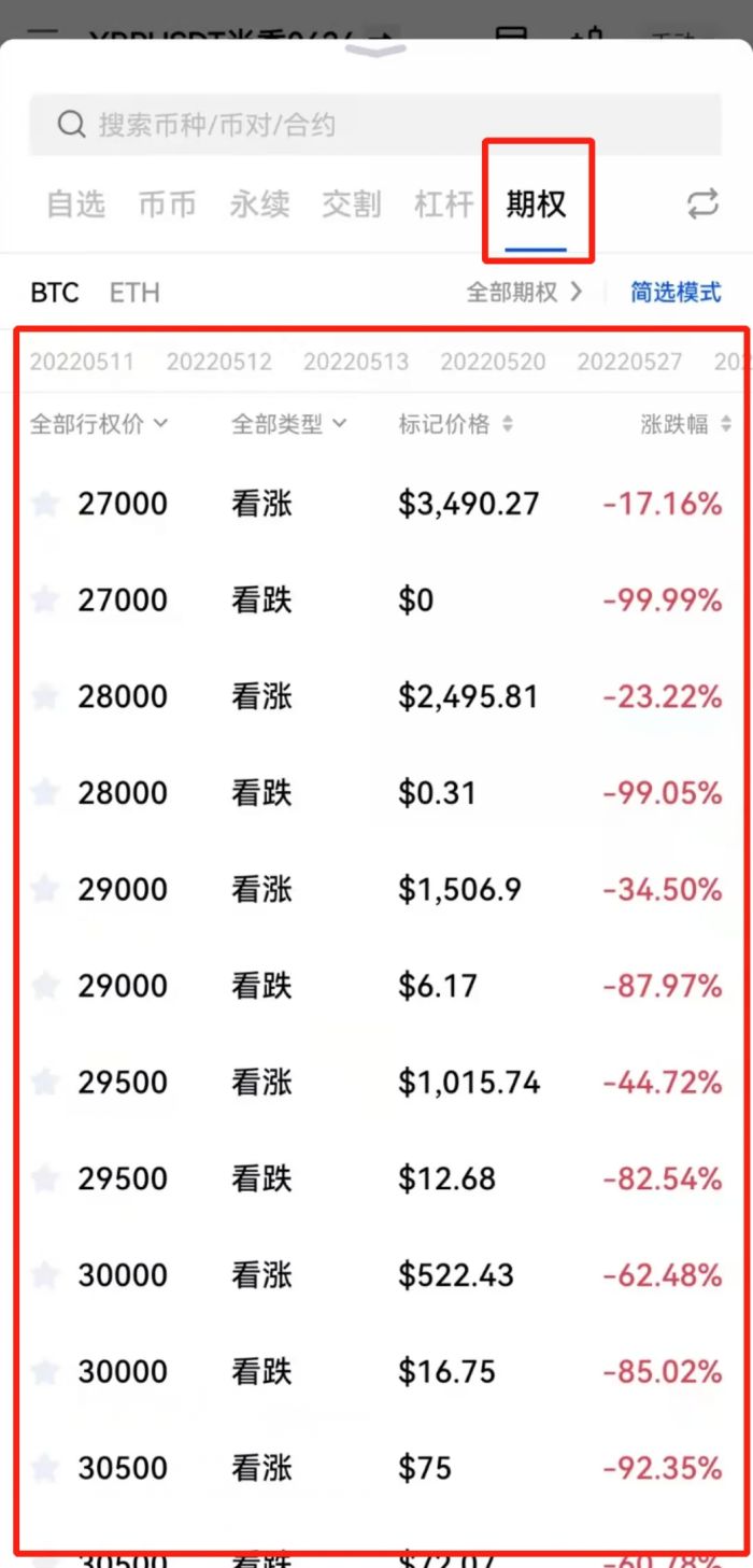 期权合约类型解释:BTCUSD(标的资产) – 20220520(到期时间,为当天16:00 HKT) – 30000(执行价格) – C(C表示看涨,P表示看跌)。
