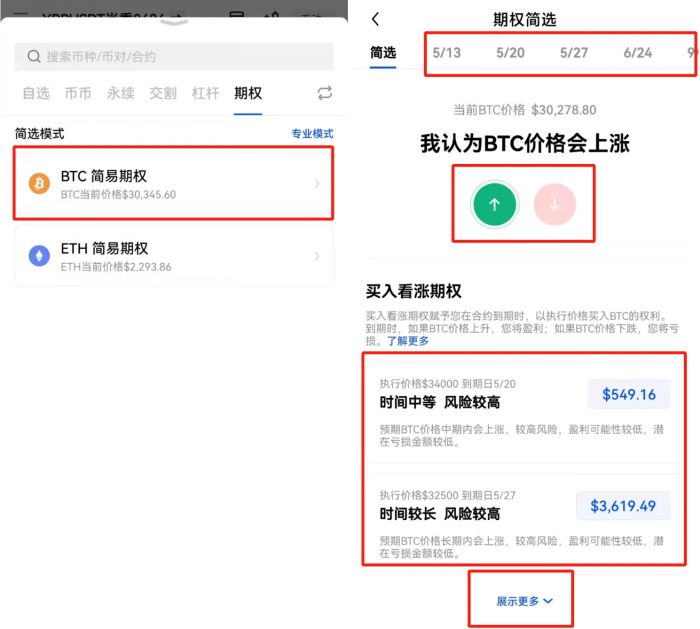 欧易提供以比特币(BTC)、以太坊(ETH)为标的资产的期权交易,当您交易账户资产总价值大于5万美元时即可买卖看涨期权和看跌期权。若您未开通期权交易,可先通过模拟盘体验期权产品,也可以选择期权简选模式购买期权。
