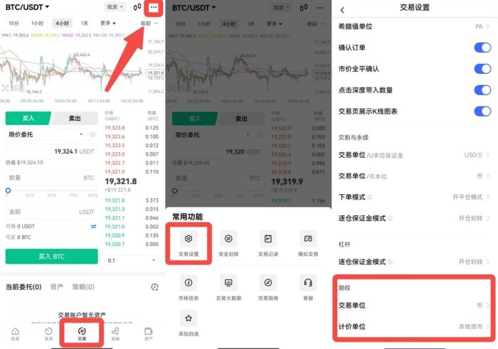 点击交易页面右上方更多图标—选择【交易设置】对交易单位等进行设置。