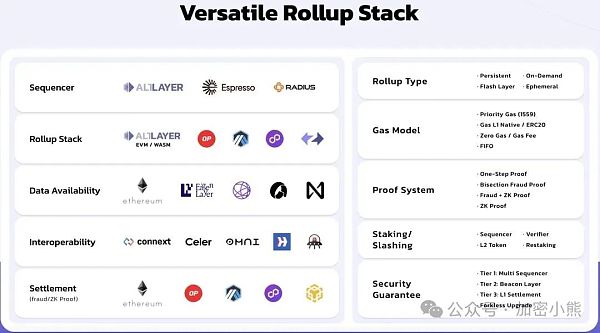 此外,AltLayer 还整合了Restaked Rollups的创新理念。一方面,AltLayer通过采用Rollup(可从任何Rollup堆栈中衍生,如OP Stack、Arbitrum Orbit、Polygon CDK、ZK Stack等),为这些Rollups提供了增强的安全性、去中心化和互操作性。