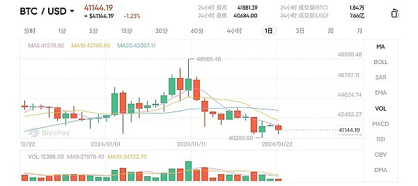 比特币在上周六零点最低一度跌到40280美元之后,随即V型反弹,整个周末持续在41500美元水平附近,以极小的幅度震荡。