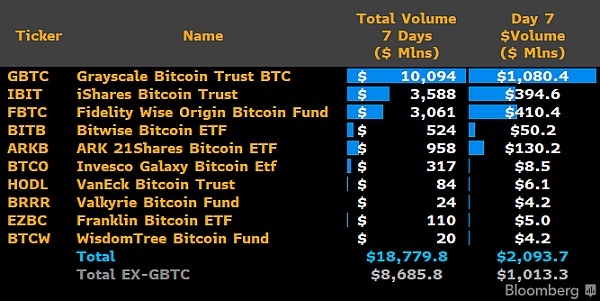 根据 CC15Capital 公布的最新数据显示,在比特币 ETF 推出后的短短 6 个交易日内,9 只新的现货比特币 ETF 已经买入约 9.5 万个 BTC,价值 39 亿美元。其中不包括 GBTC。另据彭博社 ETF 分析师 James Seyffart 在社交媒体上表示,在前 7 个交易日的总成交量略低于 190 亿美元。