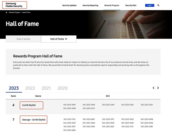 三星区块链密钥库(Samsung Blockchain Keystore)是三星设备私钥管理的重要平台。CertiK团队发现了该平台中的七个漏洞,其中四个被三星确认为关键级漏洞,另外三个为高级。 这些漏洞一旦被利用,将会造成任意代码执行(ACE)和未经授权的敏感数据泄漏等严重后果。 三星高度重视CertiK团队的发现,在漏洞发现后,三星迅速部署了安全补丁,并加入了重要的边界检查和保护机制来预防潜在风险。另一方面,此前刚刚获得荣耀安全奖励计划三等奖的CertiK安全专家Dawuge也位列此次名人堂第七位,显示了CertiK极强的集体和个人专业实力。