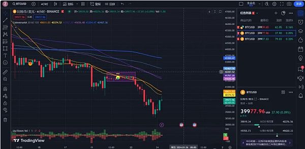 如果今天到明天价格可以站到42000以上,那么短期的多头趋势就稳了,可以继续看下一个支撑位了。(这个时候还是场外观战的好,如果昨天晚上10点的低点你没有买到那现在最好不要进场,再看看中期趋势k线情况)