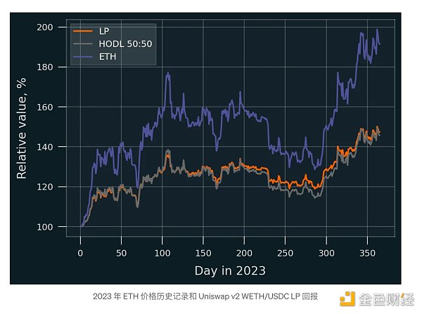 2023 年,ETH 的起价略低于 1200 美元,收盘价接近 2300 美元。这种变动导致了相对较高的发散损失(DL;也称为无常损失)。具体来说,2023 年的 DL 几乎恰好是 5%——也就是说,与 v2 池中的 LP 头寸相比,如果 LP没有收取任何费用。