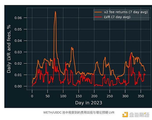 从LVR角度来看LP回报。2023 年,Uniswap v2 上的 ETH/USDC 流动性配置仍然是正预期价值博弈。手续费收入持续超过理论LVR。