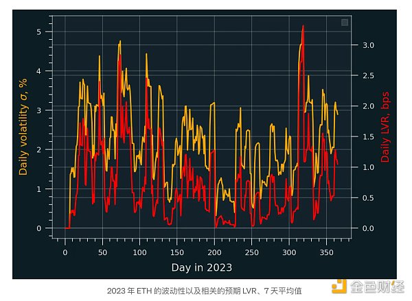 其中 P 是价格,V(P) 是矿池的价值函数。下图包括 7 天平均值σ和相应的 LVR,提供了这一点的直观表示。