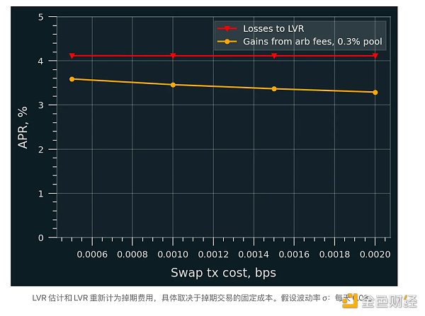 请记住,LVR 是 CEX/DEX 套利者理想条件下的理论最大损失。它假设有限合伙人不会从这些交易中赚取任何掉期费用,但现实情况并非如此。LVR 的一部分通过掉期费用被 LP 收回,而一些收入则通过固定成本交易 (tx) 费用泄漏到网络中。确切的分布主要取决于两个因素: