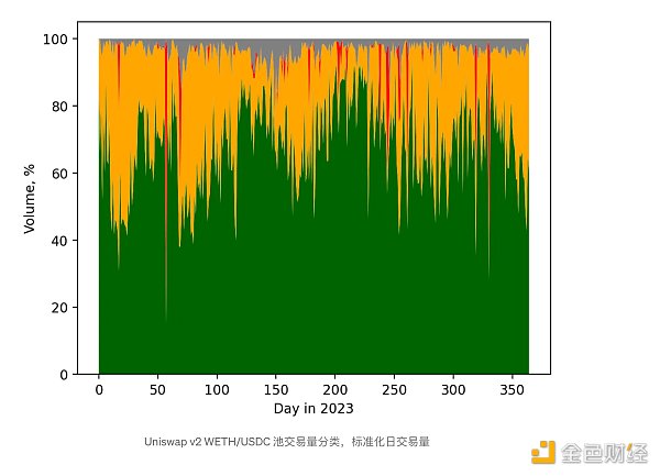池中至少 63.8% 的交易量来自与 DEX 或聚合器智能合约交互的互换,而只有 28% 到 32% 的交易量来自套利机器人。大约 80% 的 DEX 和聚合器合约量专门与一个 Uniswap 路由器合约进行交互。
