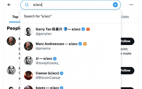 什么是e/acc?在论述其与加密货币e/acc的关联之前,我们需要深入理解e/acc这一充满开创意义的概念。“e/acc”仿佛就像是一股来势汹汹的新思潮,不仅成为人们茶余饭后的谈资,更是引得一众圈内大佬都为它摇旗呐喊。比如,A16Z的创始人Marc Andreessen和YC孵化器的CEO Garry Tan就率先把自己社交账号的名字的后缀加上了“e/acc”。在Reddit、Spaces等社区里,大家都讨论得热火朝天,在Twitter(现在的X)等社交平台上随手搜一下“e/acc”,会发现有很多人都已经在自己的名字后边加上了这几个字母。
