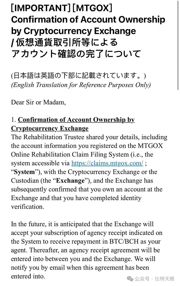 除此之外,dForce创始人杨民道今日也发推称,Mt.Gox债权人已收到邮件,确认用户早先输入的交易所地址账户所有权,作为BTC/BCH的收款地址。