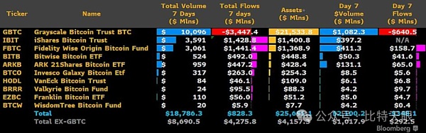 尤其是截至1月23日,所有现货比特币ETF的前7个交易日总成交量约190亿美元,而GBTC就占比过半,这也意味着目前ETF所带来的增量资金,整体仍处于对冲GBTC持续资金流出的阶段抛压。
