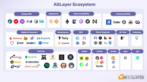 目前AltLayer的产品和客户生态系统在逐步发展壮大,拥有 EigenLayer、Espresso、Astria、Radius、Celesita、EigenDA、Avail、OP Stack、ZKStack、Arbitrum Orbit、Polygon CDK 等成熟的基础设施提供商。其它服务提供商包括:Blockscout、Dexguru、Parsec Finance、Connext、Celer、HyperLane、Transak、Halliday 等。除此之外,AltLayer还有着其它众多客户与合作项目。