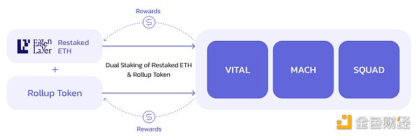 Restaked rollups利用三个模块化组件设计:VITAL(用于去中心化验证汇总状态的 AVS)、MACH(用于快速最终确定的 AVS)、SQUAD(用于分散测序的 AVS)。