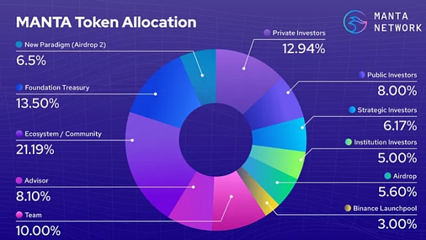 根据官方白皮书,manta总量为10亿枚,分配方案为: 生态21.9%,基金会国库13.5%,团队10%,公开销售8%,战略投资6.17%,机构投资者5%,空投5.60%,顾问8.1%,币安launchpool 3%,New Paradigm(空投 2)6.5%。