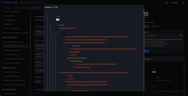 在如此庞大的数字下怎样找到我们想要检索的合约地址下的交易记录呢?通过 NFTScan NFT API 的接口之一“Get transactions by contract”可以直接快速获取,该接口可以返回某个 NFT 合约下所有的 NFT 交易列表。
