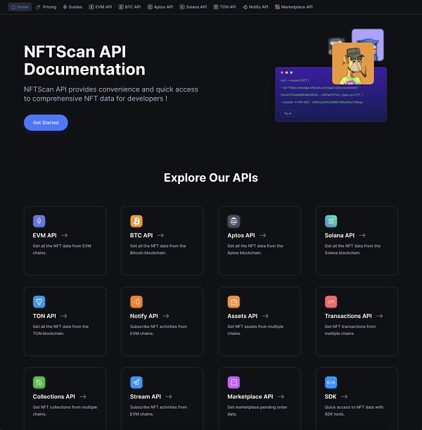 NFTScan 目前拥有全网最大最全的 NFT Collection 库,已支持 Ethereum、Solana、BNBChain、Bitcoin、TON、Polygon、zkSync、Aptos、Linea、Base、Avalanche、Arbitrum、OP Mainnet、Starknet、Scroll、Viction、Fantom、Moonbeam、PlatON、Cronos、Gnosis 21 条区块链的 NFT 全量数据,所涵盖的 NFT 数据全、种类丰富,提供一整套的接口来获得 ERC721 和 ERC1155 资产以及交易、项目、市场统计等信息,现在支持 60 多个针对 EVM 兼容链的公共接口,以及针对 Solana、Aptos、Bitcoin、TON 的一批相同模型的接口,很大程度上满足了开发者索引多种类型的 NFT 数据的需求。