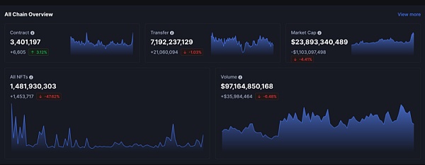 NFTScan 数据显示,截至 1 月 25 日主流区块链网络上已累计发行 NFT 资产 1,481,930,303 枚;NFT Collection 3,401,197 个;产生交易记录 7,192,237,129 条;总交易额 $97,164,850,168;市值达 $23,893,340,489。