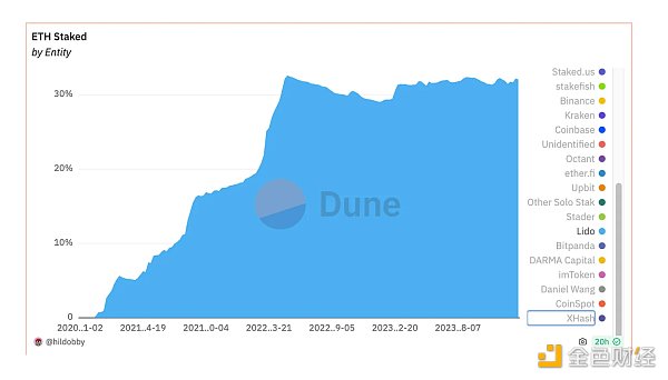 尽管所有这些新发展都在蚕食 Lido 的份额,但 Lido 在质押 ETH 中的份额仍然稳定在 31% 左右。然而,裂缝正在形成,因为其中越来越多的质押 ETH 现在由 Blast 和 Mantle 等实体控制,它们可以切换提供商或内部进行质押。