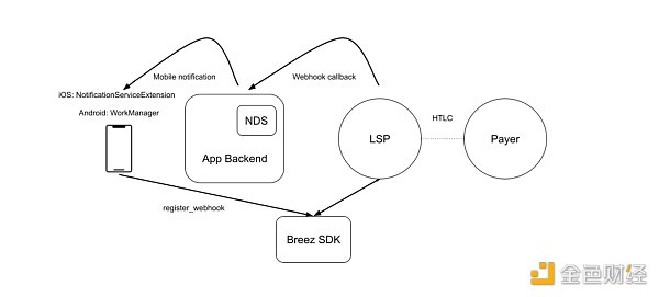 Breez SDK 方法的工作原理如下:首先,开发人员创建一个 Webhook,LSP 可以在付款过程中调用该 Webhook。一旦付款到达作为收款人之前最后一跳的 LSP,LSP 就会通过 Webhook 调用通知传送服务 (NDS),NDS 会向用户的手机发送带有说明的推送通知。开发人员需要以设置 NDS 的形式进行一些跑腿工作,但结果是更好的用户体验,因为用户不需要将应用程序保留在前台即可接收付款。它还使移动用户能够使用静态地址(例如闪电地址、LNURL-Pay 或 BOLT12)接收付款。